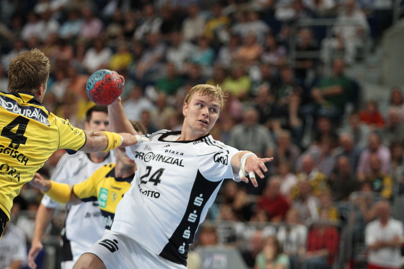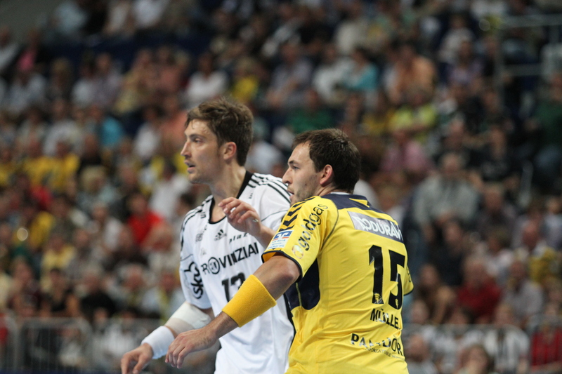 | Spielszene. | Deckungsarbeit. | Marcus Ahlm und Michael Müller. | Aron Palmarsson. | |||