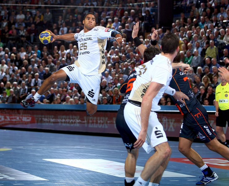| Nikola Karabatic setzt sich durch. | Daniel Narcisse. | Vid Kavticnik und Nikola Karabatic. | Thierry Omeyer. | |||