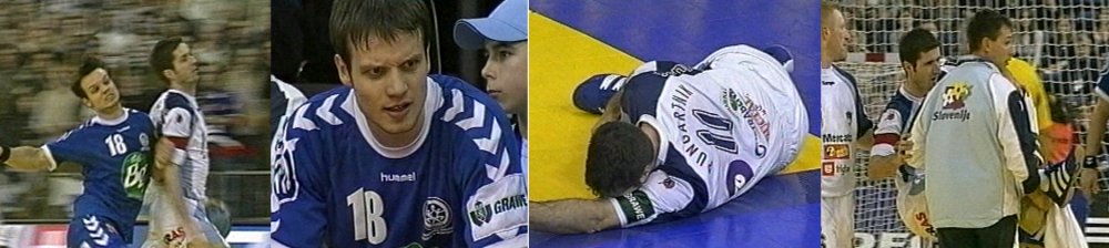 Es passierte in den Schlussminuten des Krimis zwischen Slowenien und Serbien & Montenegro. Beim Torwurf aus der Bewegung heraus, bringt ein gemeiner Stoß Pungartnik aus dem Gleichgewicht. Übeltäter ist Danijel Andjelkovic. Der Wahl-Kieler verkantet das Bein und bleibt mit schmerzverzerrtem Gesicht an Rande der Bande liegen.