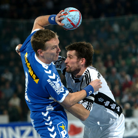 Doch der THW schraubte das Tempo nun runter und ließ die Schweriner besser ins Spiel kommen. Diese zeigten sich zwar ideen- und größtenteils auch harmlos im Angriff, konnten aber dennoch durch Rückraumtreffer von Alexander Ladig und Stefan Völkers den Rückstand in Grenzen halten. Während sich Johan Pettersson und sein Schweriner Pendant Carsten Kommoß duellierten, wer der bessere Siebenmeterschütze in der Halle ist, hielt sich der THW-Vorsprung weiterhin bei 4 bis 6 Toren Unterschied. Als Ladig in der 24. Minute den 13:9-Anschluss herstellte, brachte Noka Serdarusic Kapitän Stefan Lövgren aufs Parkett, um dem bis dato gut spielenden Martin Boquist eine Ruhepause zu gönnen - das Ostseehallen-Comeback von Lövgren war perfekt! Bis zur Pause konnte sich vor allem nochmal der quirlige Johan Pettersson, neben Torhüter Mattias Andersson in der ersten Halbzeit auffälligster Spieler des THW, mit 3 weiteren Treffern auszeichnen, so dass es mit einer beruhigenden, aber insgesamt nicht sonderlich überzeugenden 18:13-Führung in die Kabinen ging.