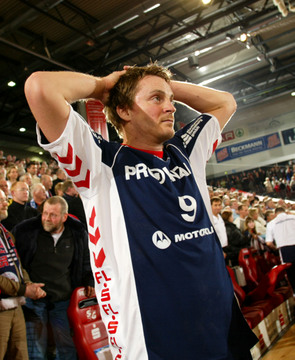 | Flensburgs Christian Berge ist die Enttäuschung ins Gesicht geschrieben. | Seine zahlreichen Tore reichten nicht: Flensburgs Lars Christiansen ist die Enttäuschung ins Gesicht geschrieben. | |||||