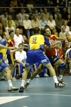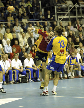 | QS-Supercup: Marcus Ahlm setzt sich gegen Demetrio Lozano durch. | QS-Supercup: Marcus Ahlm setzt sich durch. | QS-Supercup: Kim Andersson versucht die spanische Deckung zu überwinden. | QS-Supercup: Christian Zeitz. | |||