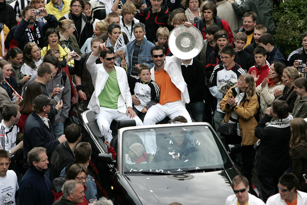 mit einem Autokorso zum Rathausplatz, wo traditionell 15.000 Fans ausgelassen