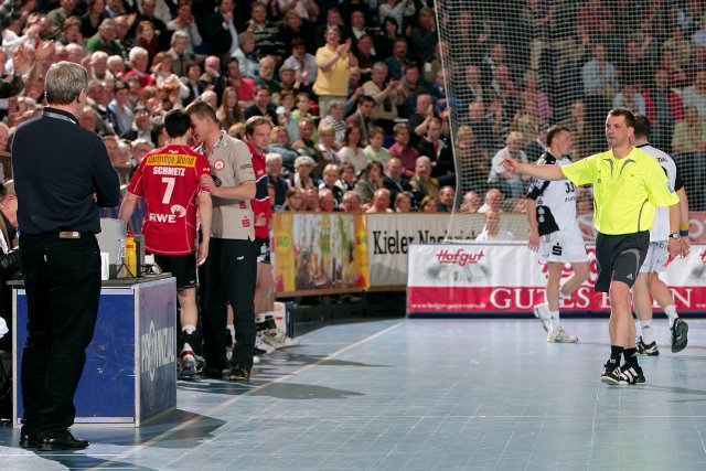 Kiel gegen Essen, diese Spiele waren einst Klassiker. Unvergessen der 25:15 (10:3)-Sieg des TuSEM im November 1990 in der Ostseehalle. Es war das letzte Spiel, das der Rekordmeister im DHB-Pokal zu Hause verlor. Linksaußen Uwe Schwenker, heute THW-Manager, verwarf damals beim Stand von 2:7 einen Siebenmeter. Und Raubein Kristof Schargy, inzwischen TuSEM-Trainer, kassierte alle drei Zeitstrafen für die Westdeutschen. Alte Geschichten, die der aktuelle Kader der Gäste nur in den ersten 13 Minuten bestätigen konnte. 8:6 führte der Tabellen-16., der in seinen beiden Holländern die auffälligsten Figuren besaß. Torhüter Gerrie Eijlers avancierte zum besten TuSEM-Spieler, Rechtsaußen Mark Schmetz zum unbeliebtesten. Offensichtlich übermotiviert biss sich der 31-Jährige erst in Zweikämpfen mit Henrik Lundström fest. Als THW-Trainer Noka Serdarusic das Duell abkühlte und Lundström durch Dominik Klein ersetzte, wählte sich der 113-fache Nationalspieler Nikola Karabatic als Reibungsfläche und sah nach zwei klaren Fouls an ihm in der 51. Minute sogar die Rote Karte.
