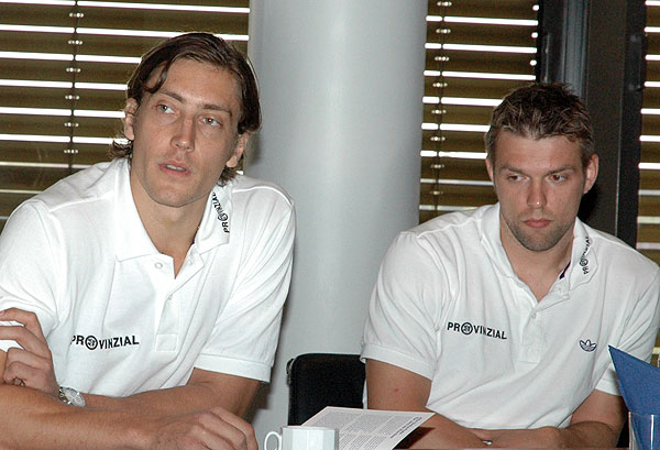 | Saisoneröffnungspressekonferenz 2009: Momir Ilic und Peter Gentzel. | Saisoneröffnungspressekonferenz 2009: Marcus Ahlm und Christian Sprenger. | Saisoneröffnungspressekonferenz 2009: THW-Pressesprecher Goos, Provinzial-Vorstand Wilby und THW-Aufsichtsratsvorsitzender Vater. | Saisoneröffnungspressekonferenz 2009. | |||