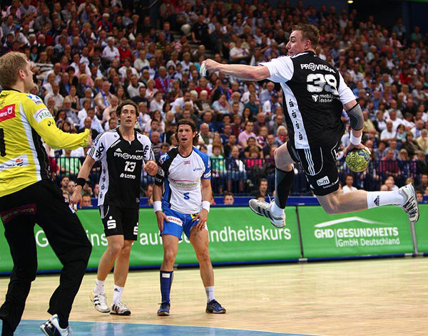 Doch die "Zebras" zogen sich in der Abwehr auf eine etwas kraftsparendere 6:0-Variante zurück, was zum Einen dem bislang enttäuschenden Pascal Hens entgegen kam. Zum Anderen drückte nun Domagoj Duvnjak der Partie mehr und mehr seinen Stempel auf, bei seinem Treffer zum 22:23 waren die Hamburger wieder dran. Als der Kroate nicht nur einen Ilic-Siebenmetertreffer konterte, sondern Christian Zeitz auch noch für zwei Minuten auf die Bank musste, leckten die Gastgeber und ihre Fans noch einmal Blut. Alfred Gislason beorderte nun Oldie Peter Gentzel für den glücklosen Thierry Omeyer in den Kasten, und diese Einwechslung machte sich sogleich bezahlt: Der Schwede parierte erst einen Wurf von Marcin Lijewski und entschärfte dann sogar zwei Gewaltwürfe Duvnjaks. Durch Ilic und Jicha legten die Kieler wieder auf 27:25 vor und hatten durch Sprenger die Möglichkeit, den Vorsprung gar auf drei zu erhöhen. Der Kieler Rechtsaußen wurde jedoch bei seinem Wurf unfair von Pascal Hens gestoppt, was die ansonsten vernünftig leitenden Unparteiischen Methe/Methe allerdings nicht ahndeten und damit das 26:27 ermöglichten. Nach einem Missverständnis zwischen Palmarsson und Narcisse hatten die Gastgeber sogar noch einmal die Chance zum Ausgleich, doch wieder zeigte Peter Gentzel seine Klasse: Der schwedische Torhüter hechtete einem geblockten Wurf hinterher und sicherte damit den Torabwurf für den THW. Zu diesem Zeitpunkt waren noch fünf Minuten zu spielen.