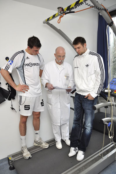 Vor jedem großen Turnier will Handballnationaltrainer Heiner Brand auf Nummer sicher gehen. Darum lässt er seinen Kader im Herz- und Diabeteszentrum sportkardiologisch untersuchen. "Trotz der enormen Belastung durch Bundesliga, Pokal- und Champions-League-Spiele sind bisher alle fit gewesen", zieht Kardiologe Mellwig ein positives Zwischenfazit seiner Untersuchungen. Bis Ende Dezember sollen dann alle Nationalspieler einmal in Bad Oeynhausen gewesen sein. Im neuen Jahr beginnt für die Nationalspieler direkt die Vorbereitung auf die Handball-WM in Schweden. "Da die Spieler keine langen Regenerationsphasen haben, ist es umso wichtiger, dass sie diesen Spielemarathon kerngesund angehen", betont Dr. med. Klaus Peter Mellwig die Bedeutung der Untersuchung des Herz- Kreislaufsystems.