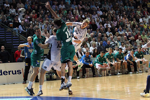 Es blieb aber in der Folge eine ausgeglichene Partie, in der sich beide Mannschaften schwer taten, die gegnerische 6:0-Deckung zu knacken. Als Filip Jicha einen Siebenmeter übers Tor warf und Linkshänder Daniel Valo zweimal Palicka überwinden konnte, stand es nach 17 Spielminuten wieder 8:8 unentschieden. Ein Doppelschlag von Sprenger bedeutete dann das 10:8, und nachdem Thierry Omeyer einen Strafwurf von Alois Mraz entschärfte, brachte Ilic den "Zebras" beim 11:8 den ersten Drei-Tore-Vorsprung. Sicherheit brachte dies den Kielern allerdings noch immer nicht. Zwei weitere Paraden des im ersten Durchgang starken Nikolai Weber, zwei Einzelaktionen von Alois Mraz und der dritte Treffer von Daniel Valo brachten sechs Minuten vor dem Seitenwechsel den erneuten Ausgleich zum 11:11.