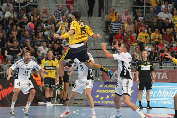 Die Kieler jedoch starteten nun mit Wut im Bauch in ihre bis dahin stärkste Phase. Mit einem phänomenalen Stemmwurf aus dem Rückraum traf Dominik Klein zum 10:13, ehe Groetzki einen Heber aus eigentlich gutem Winkel neben das Tor setzte. Der erneut starke Andersson tankte sich im Anschluss durch die Löwen-Deckung zum 11:13, Jicha beantwortete einen Gunnarsson-Treffer postwendend zum 12:14. Der THW Kiel war nun am Drücker, was auch Löwen-Trainer Gudmundsson bemerkte und Lund und Bielecki für Schmid und Sesum aufs Spielfeld beorderte. Alfred Gislason aber reagierte postwendend auf die wurfstarken Einwechslungen und beorderte seine mittlerweile defensiver stehende Deckung wieder zur offensiveren 3:2:1-Formation. Dies hatte zur Folge, dass Bielecki gar nicht in Wurfposition kam und Börge Lund und Michael Müller viel Verantwortung übernehmen mussten. Zweimal versuchte es Müller, dreimal Lund, doch jedes Mal scheiterten sie am immer stärker werdenden Thierry Omeyer. Auf der anderen Seite hingegen konnte Goran Stojanovic nach seiner starken Anfangsphase gar keinen Ball mehr stoppen, so dass die Kieler durch Jicha und Sprenger zum 14:14-Ausgleich kamen. Auch Gudmundssons Auszeit konnte den THW-Express nicht stoppen, Jicha gelang in der 25. Spielminute die erste Führung, die Palmarsson mit einer tollen Einzelaktion und Narcisse per Durchbruch gar auf 17:14 erhöhten. Nach einem weiteren klasse Treffer Palmarssons aus dem Stand zum 18:15 und einem Wahnsinnsgeschoss Gensheimers aus dem Rückraum zum Pausenstand wurden beide Mannschaften mit viel Applaus in die Kabinen begleitet.