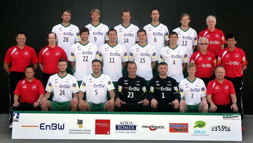 Oben von links: Physiotherapeut Dekrell, Schubert, Oprea, Rutschmann, Tahirovic, Schöne, Arzt Dr. Vollmer; Mitte von links: Physiotherapeut Hummel, Physiotherapeut Müller, Rnic, Mrvaljevic, Haaß, Kneule, Betreuer Heinrich, Trainer Petkovic;