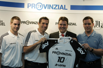 | Saisoneröffnungspressekonferenz 2008: Alfred Gislason. | Saisoneröffnungspressekonferenz 2008: Andreas Palicka, Stefan Lövgren, Ulrich Rüther (Provinzial) und Alfred Gislason. | Öffentliches Training 2008: Alfred Gislason. | Öffentliches Training 2008: Christian Zeitz und Alfred Gislason. | |||