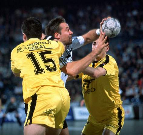 | Autogrammkarte 2001/2002. | Morten Bjerre. | Bjerre gegen Lozano, rechts Wislander am Kreis. | Morten Bjerre wird von der ABC-Deckung gestoppt. | |||