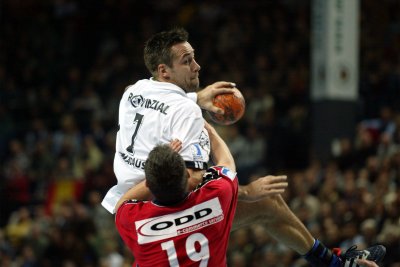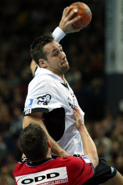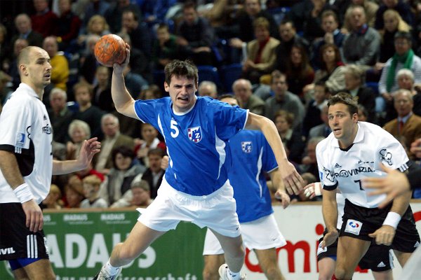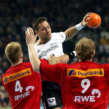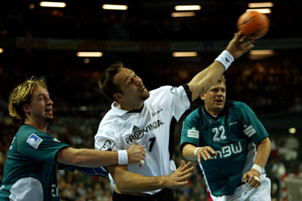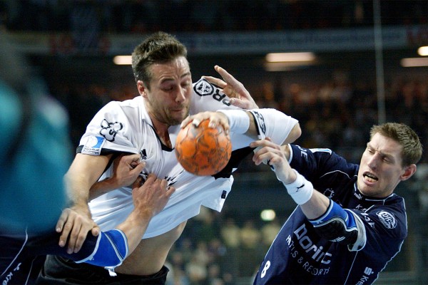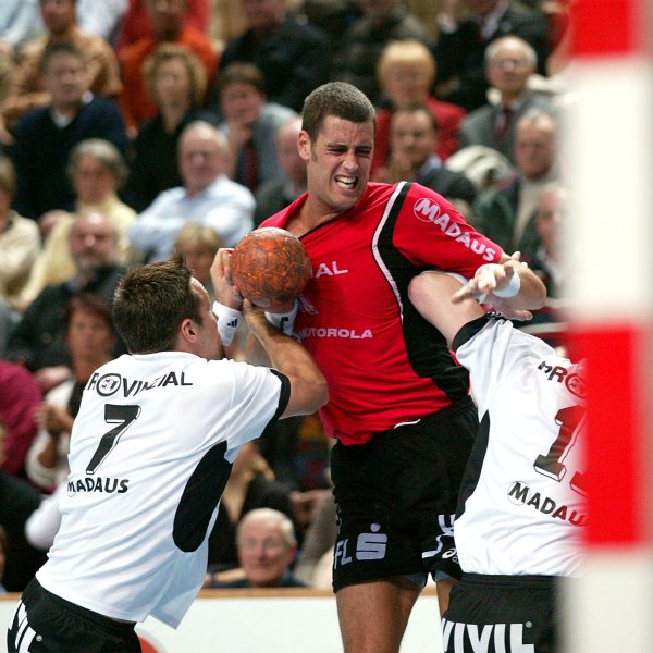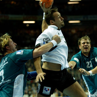 | Senianin Maglajlija setzt sich gegen Dominikovic und Bjerre durch. | Blazenko Lackovic gegen Bjerre. | Die THW-Deckung packt zu. | Morten Bjerre. | |||