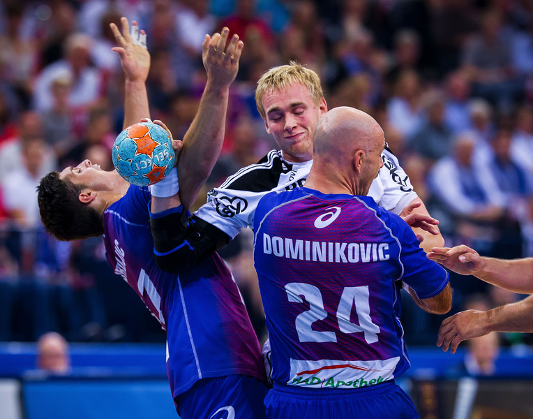 | Senianin Maglajlija setzt sich gegen Dominikovic und Bjerre durch. | Die THW-Deckung packt zu. | Davor Dominikovic. | Davor Dominikovic. | |||