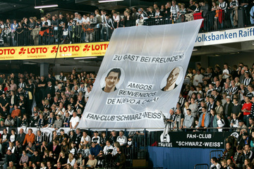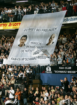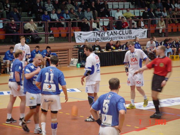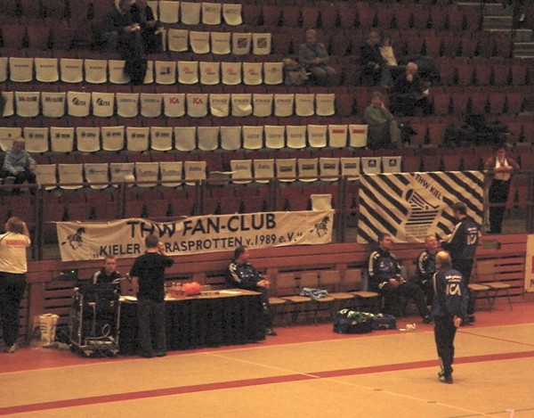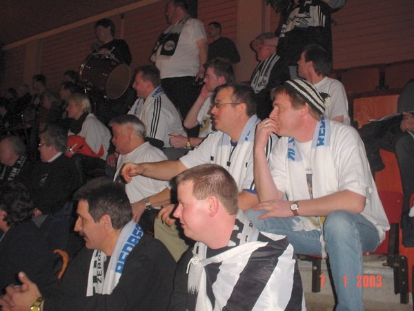 | Göteborg-Tour 2003: Kurz vor der Partie. | Göteborg-Tour 2003: Max - nun in weiß-blau mit der Nummer 22! | Göteborg-Tour 2003: Stimmung durch die Zebra-Fans. | Göteborg-Tour 2003: Stimmung durch die Zebra-Fans. | |||