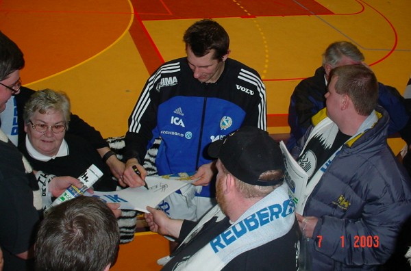 | Göteborg-Tour 2003: Magnus Wislander in action. | Göteborg-Tour 2003: Stimmung durch die Zebra-Fans. | Göteborg-Tour 2003: Am Ende siegt Redbergslid über Skövde mit 31:24 (16:11). | Göteborg-Tour 2003: Magnus Wislander mit dem Zebra-Besuch aus seiner zweiten Heimat. | |||