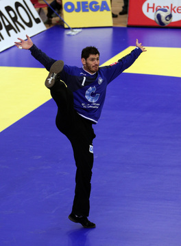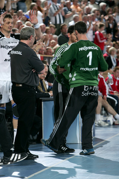| Aufregung. | Spielszene. | Oliver Roggisch und Henning Fritz. | Dominik Klein gegen Henning Fritz. | |||