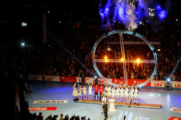 | Lichtermeer zum Einlauf. | Immer wieder schön: Die Ostseehalle | Die neue, große Ostseehalle. | Von ganz oben... | |||