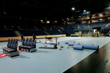 | Der linke vierte Rang. | Riesige Gerüste umkleiden die Ostseehalle. | Offene Ostseehalle: Durch das Gerüst sieht man den Himmel. | Die Ostseehalle im Umbau. | |||