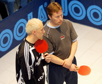 | Schwedisches Doppel: Tischtennis-Star Jan-Ove Waldner (rechts) und Handball-Star Johan Pettersson (links, Profi des THW Kiel). | Schwedisches Doppel: Tischtennis-Star Jan-Ove Waldner (rechts) und Handball-Star Johan Pettersson (links, Profi des THW Kiel). | Jörg Rosskopf (rechts oben) und Dr. Dirk Luckow (rechts unten, Direktor der Kunsthalle) trafen in der Kunsthalle Kiel auf Jan-Ove Waldner (SWE, links unten) und Johan Petersson (links oben). | Jörg Rosskopf und Dr. Dirk Luckow trafen in der Kunsthalle Kiel auf Jan-Ove Waldner und Johan Petersson. | |||