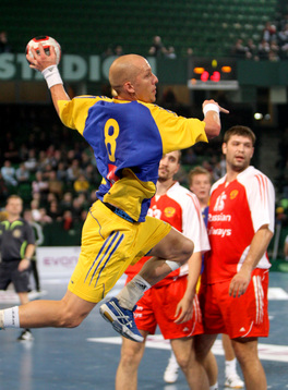 | Johan Pettersson zieht mit einem Sprungwurf ab, im Hintergrund Daniel Brack. | Johan Pettersson setzt zum Torwurf an. | Johan Pettersson reckt jubelnd beide Fäuste in die Luft. | Johan Pettersson wirft. | |||