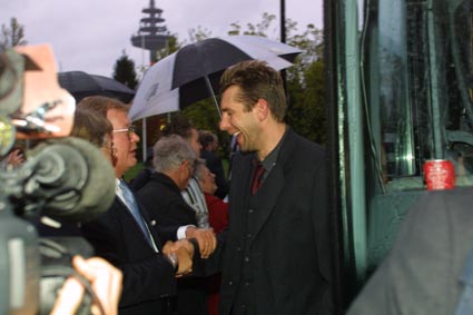 | EHF-Pokal-Finale 2002, Rückspiel: "Nur noch sechs Spiele. Ich bin ein bißchen traurig" | EHF-Pokal-Finale 2002, Rückspiel: Empfang am Vereinsheim - Wislander mit Provinzial-Vorstandsvorsitzendem Reime. | EHF-Pokal-Finale 2002, Rückspiel: Empfang am Vereinsheim. | Wislander, Roggisch, Petersen. | |||