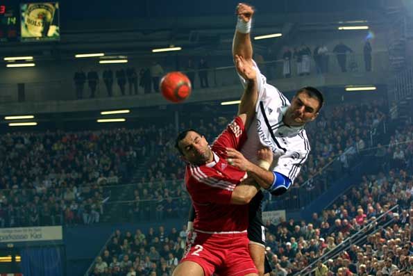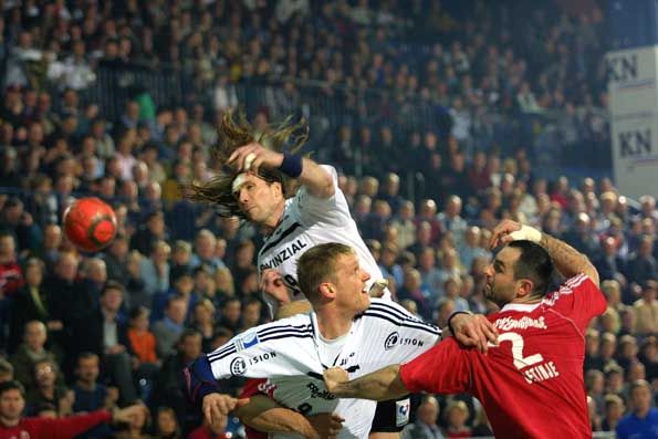 | Staffan Olsson - mit dickem Pflaster. | Teamwork: Petersen blockt, Olsson trifft. | Staffan Olsson. | Zeigte gegen seinen ehemaligen Verein eine tolle Partie: Nenad Perunicic. | |||