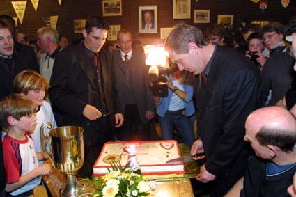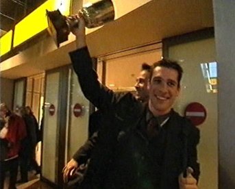 | EHF-Pokal-Finale 2002, Rückspiel: Empfang am Vereinsheim - Johan mit dem Pott. | EHF-Pokal-Finale 2002, Rückspiel: Empfang am Vereinsheim - Johan und Mattias mit dem Pott. | EHF-Pokal-Finale 2002, Rückspiel: Empfang am Vereinsheim. | ||||