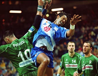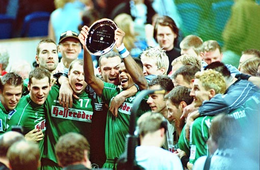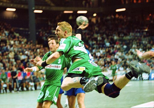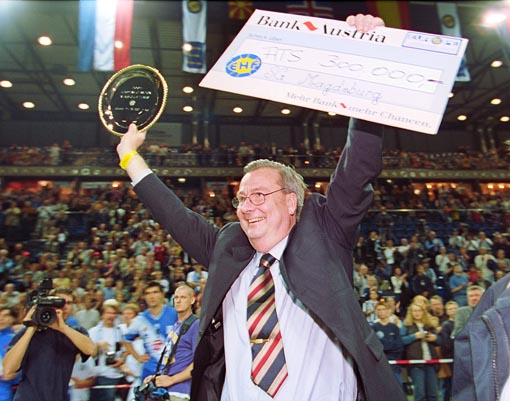 | Finale: Magdeburg - San Antonio: Sieger Magdeburg. | Finale: Magdeburg - San Antonio: Sieger Magdeburg. | EHF-Präsident Holmquist. | Roland Reime ehrt Stefan Lövgren als besten Spieler der Vereins-EM 2001. | |||