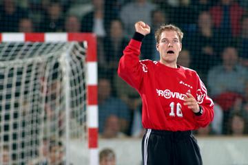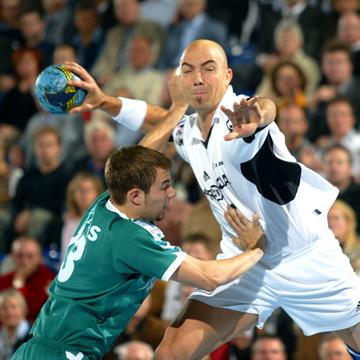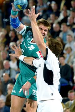 | Henning Fritz. | Demetrio Lozano gegen Jan-Fiete Buschmann. | Marcus Ahlm setzt sich durch. | Marcus Ahlm setzt sich durch, im Hintergrund Bezdicek und Ziercke. | |||