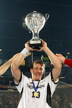 | Die Mannschaft jubelt. | Henning Fritz mit dem Pokal. | Demetri Lozano in der Champagnerfontäne. | Demetri Lozano in der Champagnerfontäne. | |||