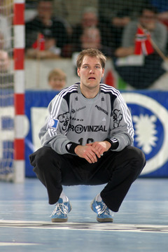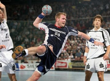 | Kapitän Stefan Lövgren während einer Auszeit. | Adrian Wagner greift sich nach einem Foul an den Hals. | Norwegische Freunde: Glenn Solberg, Frode Hagen und Johnny Jensen. | SG-Kapitän Sören Stryger am Ball. | |||