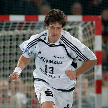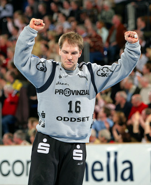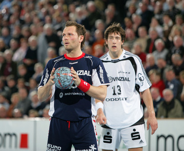 | Frode Hagen gibt Anweisungen. | Lars Christiansen am Ball, im Hintergrund Marcus Ahlm. | Frode Hagen hat die Finger seiner rechten Wurfhand stark getapet und hält damit einen Ball. | Hatten auch als Konkurrenten ihren Spaß: Kiels Frode Hagen und Flensburgs Joachim Boldsen. | |||