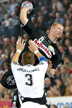 | Gregor Tkaczyk. | Marcus Ahlm setzt sich durch. | Frode Hagen lässt sich von Joel Abati nicht stoppen. | Sebastian Preiß gegen Karol Bielecki. | |||