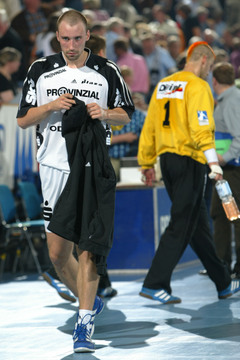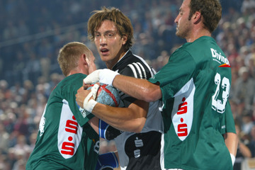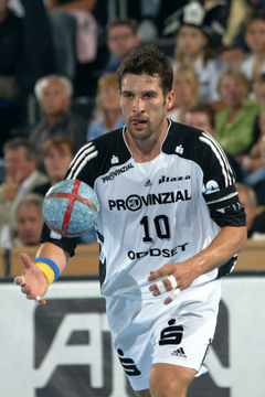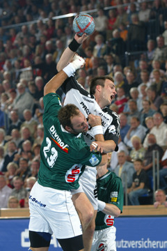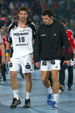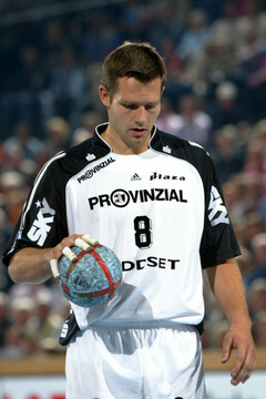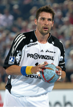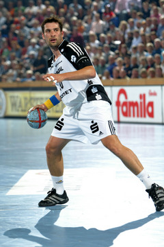 | Stefan Lövgren beim Siebenmeterwurf. | Stefan Lövgren beim Siebenmeterwurf. | Kim Andersson. | Vid Kavticnik beim Wurf von Außen. Im Hintergrund sieht Göppingens Nikola Manojlovic zu. | |||