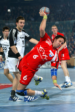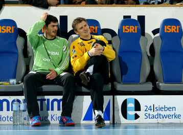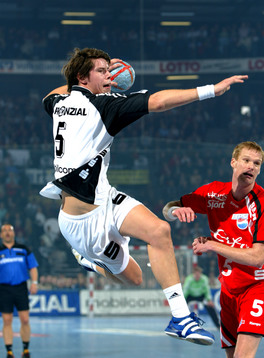 | THW-Torhüter Henning Fritz fachsimpelt während der Halbzeitpause mit seinem Kollegen Peter Gentzel von der HSG Nordhorn. | Nordhorns Holger Glandorf wird beim Wurf von THW-Mittelmann Viktor Syilagyi attackiert. | Iwan Usric beim Wurf aufs Tor. | Iwan Usric beim Wurf aufs Tor. | |||