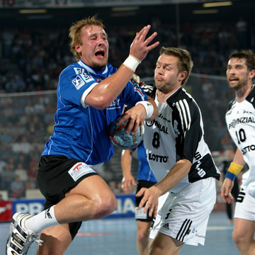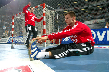 | Pfullingens Petr Kust (links) setzt sich gegen Frode Hagen in Szene. Rechts Stefan Lövgren. | Kiels dritter Torwart Dennis Klockmann dehnt sich während der Halbzeitpause auf dem Spielfeld. Im Hintergrund Mattias Andersson. | Kiels dritter Torwart Dennis Klockmann dehnt sich während der Halbzeitpause auf dem Spielfeld. Im Hintergrund Mattias Andersson. | Kiels dritter Torwart Dennis Klockmann dehnt sich während der Halbzeitpause. | |||