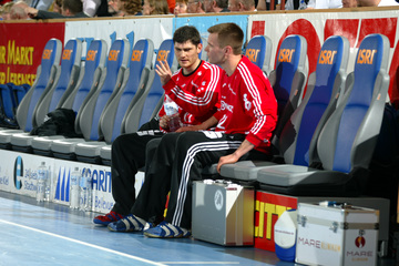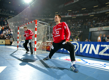 | Kiels dritter Torwart Dennis Klockmann dehnt sich während der Halbzeitpause. | Tipps vom Welthandballer des Jahres 2004: Henning Fritz nutzt die Halbzeitpause, um sich mit seinem Ersatz-Torwart Dennis Klockmann zu unterhalten. | Dennis Klockmann schreibt Autogramme. | Dennis Klockmann. | |||