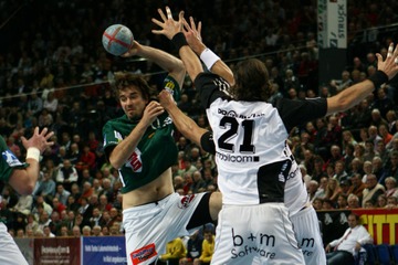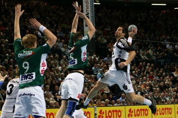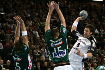 | Nikola Karabatic. | Marcus Ahlm verteidigt. | Pelle Linders ist durch. | Jubel beim SCM. | |||