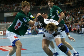 | Marcus Ahlm am Kreis. | Nikola Karabatic setzt sich durch. | Stefan Lövgren gegen Silviu Baiceanu. | Dominik Klein. | |||