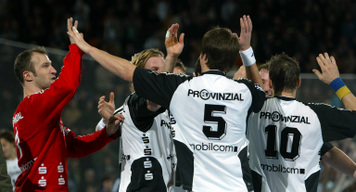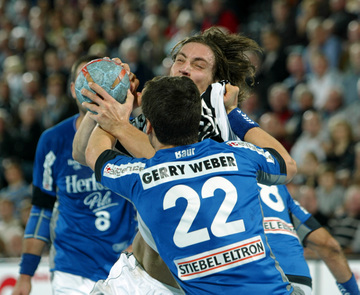 | Pelle Linders attackiert Tomas Mocsai. | Nikola Karabatic attackiert Filip Jicha. | Logi Geirsson. | Die Schiedsrichter Methe/Methe. | |||
