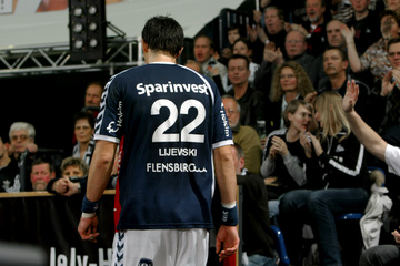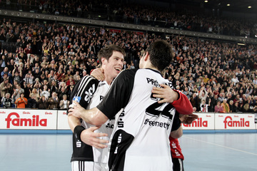 | Marcin Lijewski verlässtg nach seine dritten Zeitstrafe das Feld. | Marcus Ahlm. | Vid Kavticnik. | Kieler Jubel nach dem Sieg. | |||