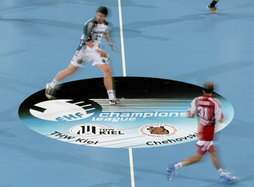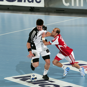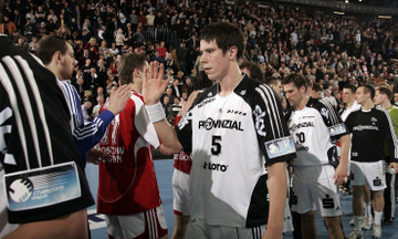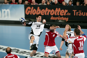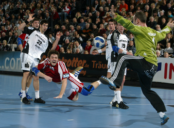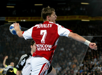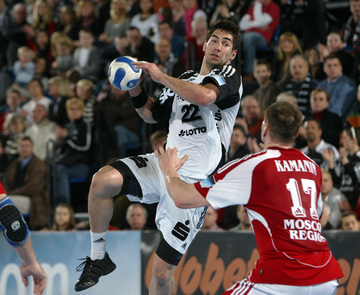 | Omeyer und Serdarusic. | Moskaus Trainer Vladimir Maximov. | Dominik Klein wird attackiert. | Nikola Karabatic greift an. | |||
