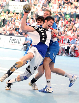 | Nikola Karabatic im Angriff. | Filip Jicha. | Rudelbildung. | Filip Jicha. | |||