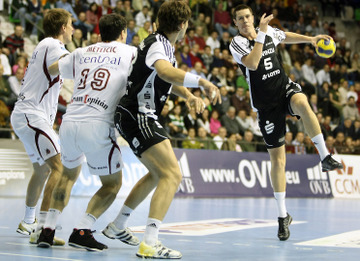 | Talant Dushjebaev. | Spielszene. | Zufriedenheit nach dem Spiel. | Abalo gegen Karabatic. | |||