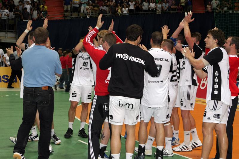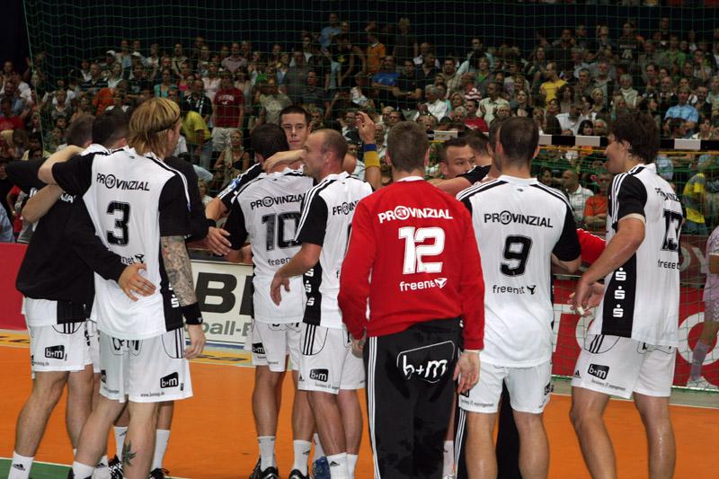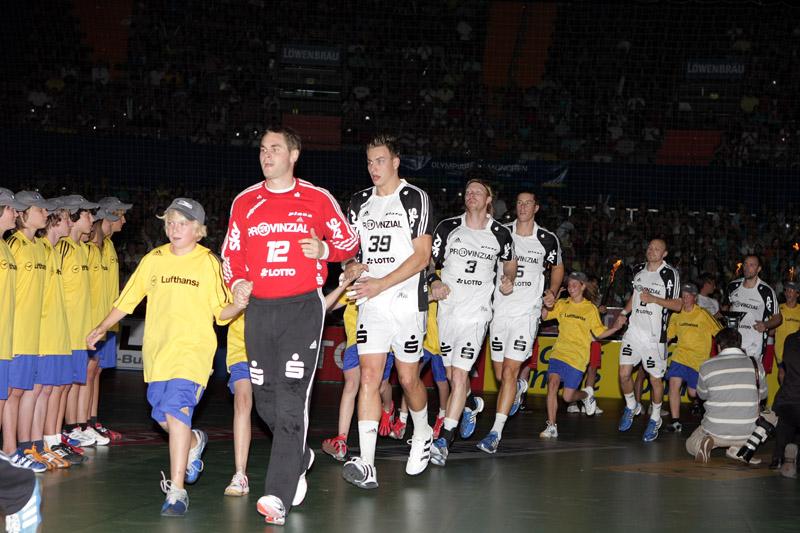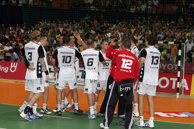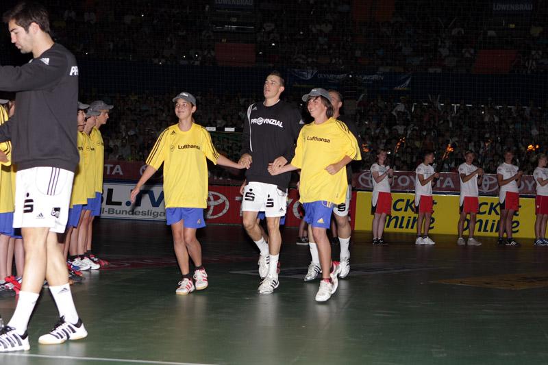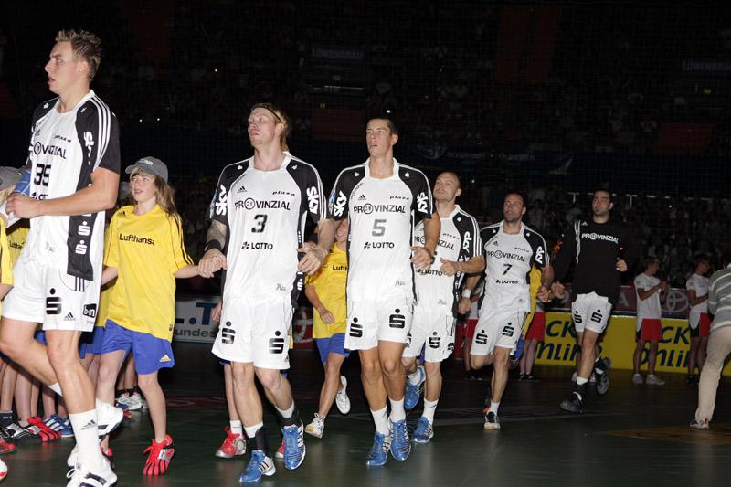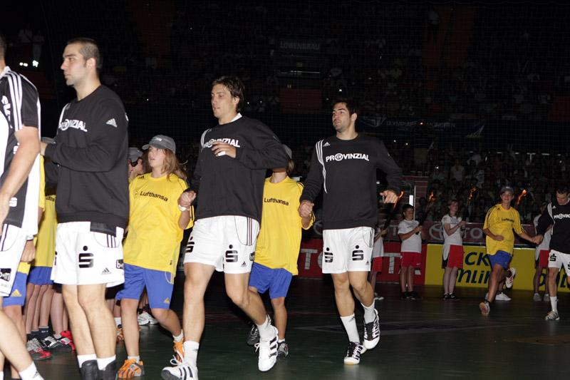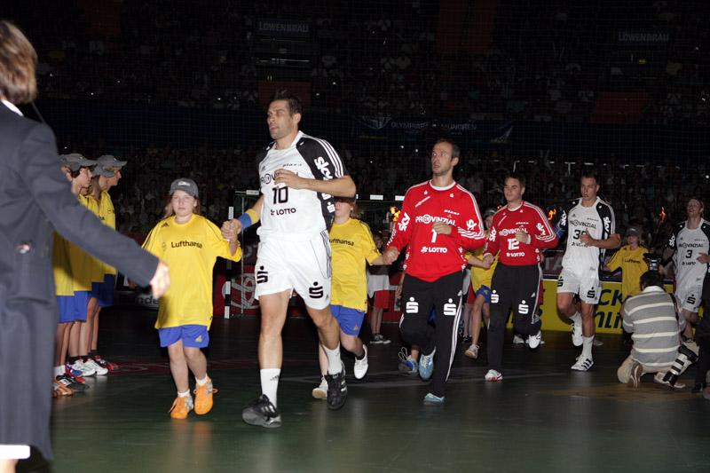 | Supercup 2008: Einlauf der Zebras. | Supercup 2008: Einlauf der Zebras. | Supercup 2008: Alfred Gislason. | Supercup 2008: HBL-Vorstand Rainer Witte beglückwünscht Thierry Omeyer zum Olympiasieg. | |||