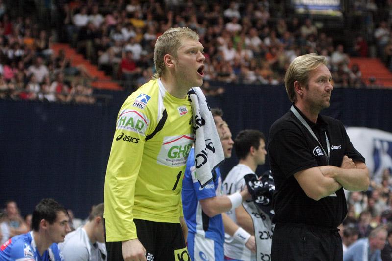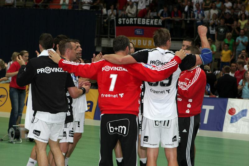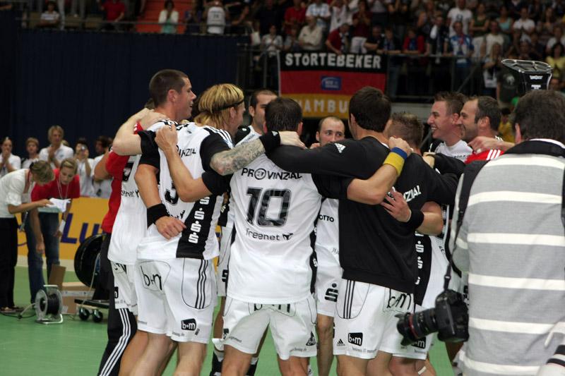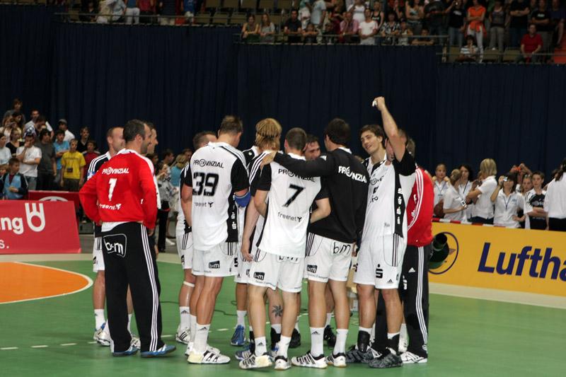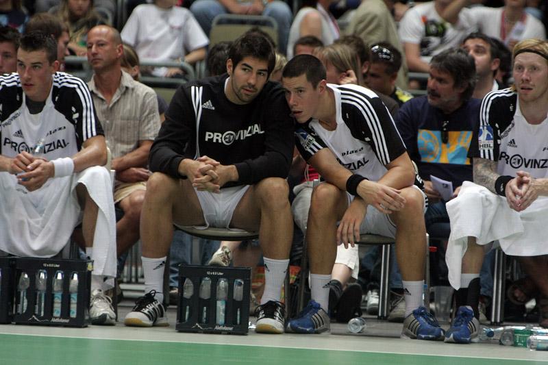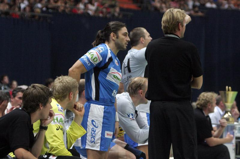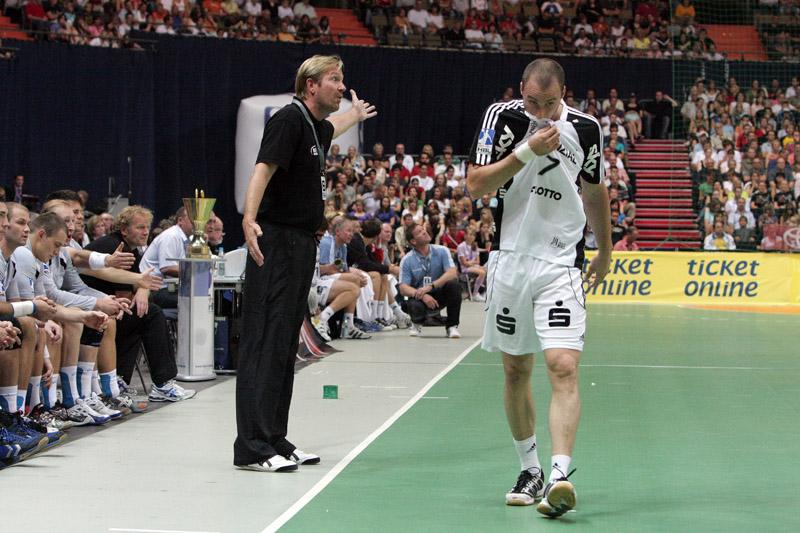 | Supercup 2008: HBL-Vorstand Rainer Witte beglückwünscht Nikola Karabatic zum Olympiasieg. | Supercup 2008: HSV-Trainer Martin Schwalb. | Supercup 2008: Vid Kavticnik. | Supercup 2008: Hendrik Lundström. | |||