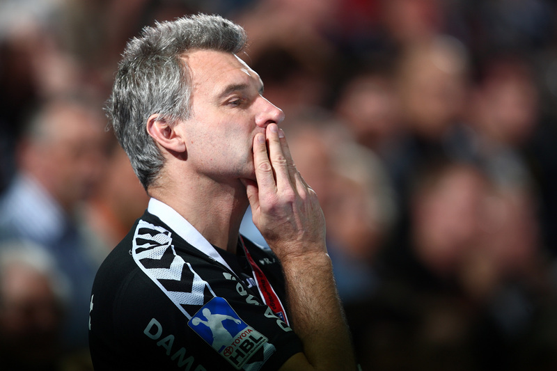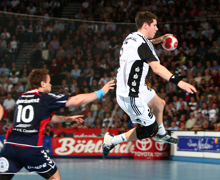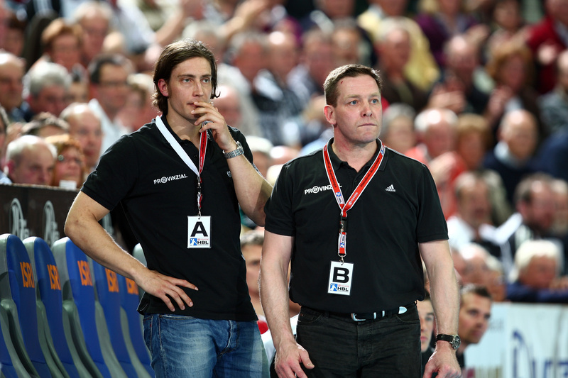 | Marcus Ahlm und Alfred Gislason. | Flensburgs Trainer Per Carlen. | Momir Ilic und Tobias Karlsson. | Filip Jicha und Tobias Karlsson. | |||