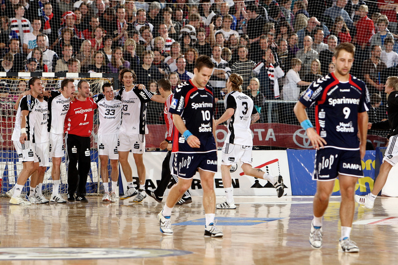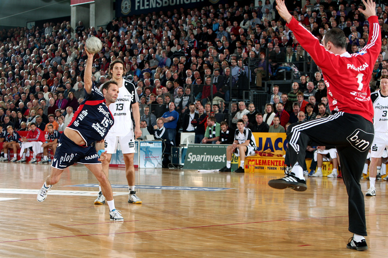| Die Kieler Deckung packt zu. | Lars Christiansen vs. Thierry Omeyer. | Vor dem Spiel. | Spielszene. | |||