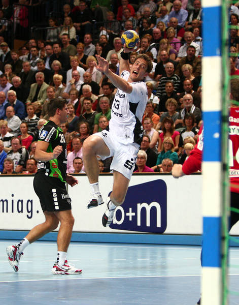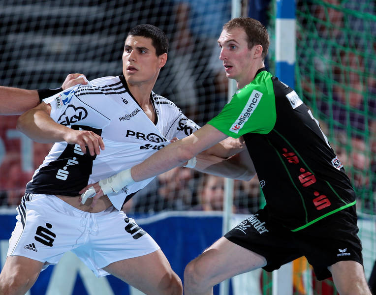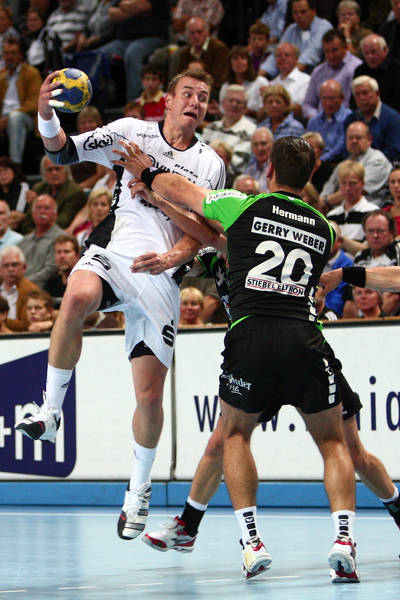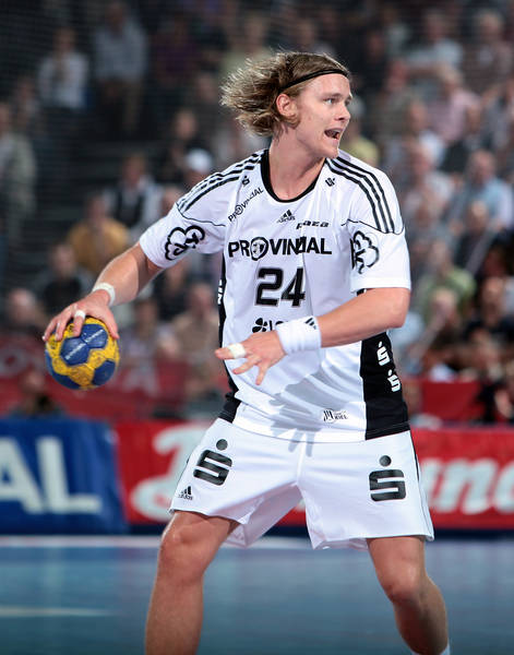 | Milutin Dragicevic gegen Holger Glandorf. | Spielszene. | Filip Jicha. | Aron Palmarsson. | |||